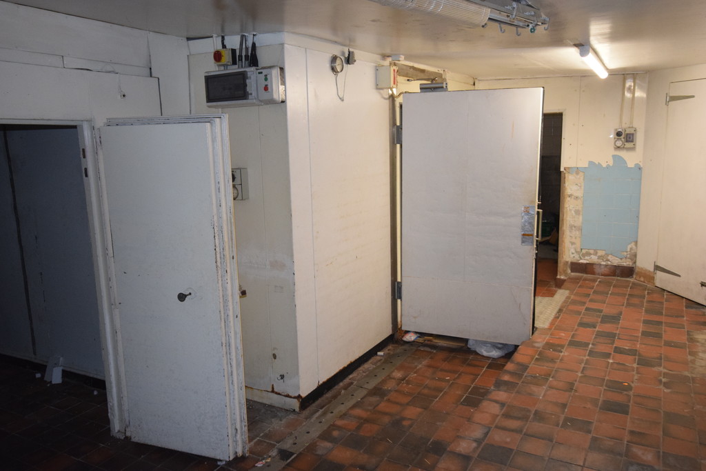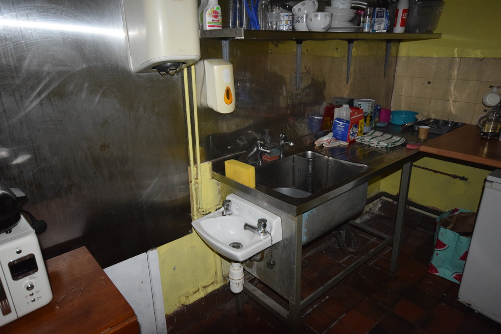 Stainless steel sink and drawer, hand wash basin, commercial extraction hood, storage room and stairs to first floor.