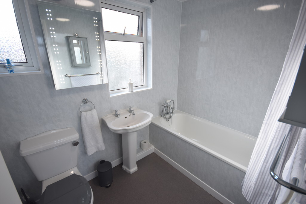 BATHROOM Double glazed frosted window, white 3-piece suite, low level WC, pedestal hand basin with taps, panelled enclosed bath with telephone style mixer taps/shower head, panelled enclosed walls, radiator and panelled ceiling