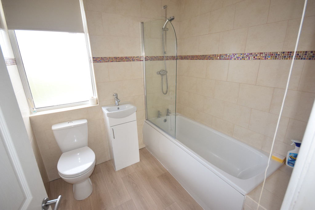 BATHROOM Frosted double glazed window, 3 piece suite, low level WC, hand wash basin with mixer taps, glass vanity unit, panel enclosed bath with taps/shower over, tiled walls, laminate flooring and sensor lighting.