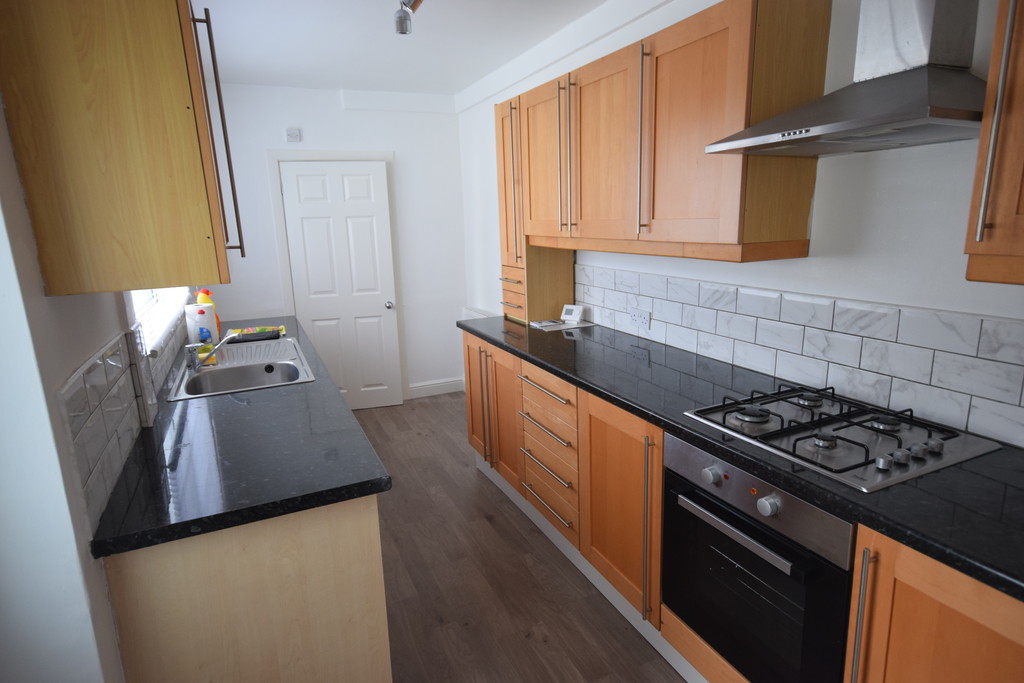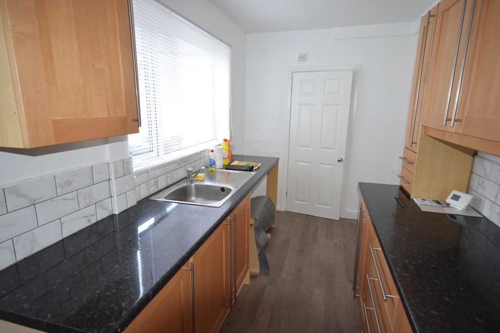 KITCHEN Double glazed door, double glazed window, fitted wall and base drawer units with black work tops to compliment, inset stainless steel sink unit with mixer taps, plumbed for washing machine, inset oven, hob with extractor over, tiled splash area, laminate flooring and a radiator.