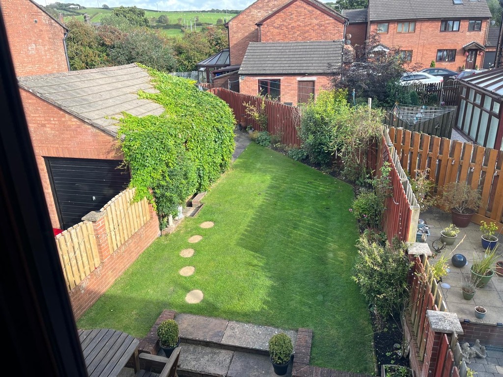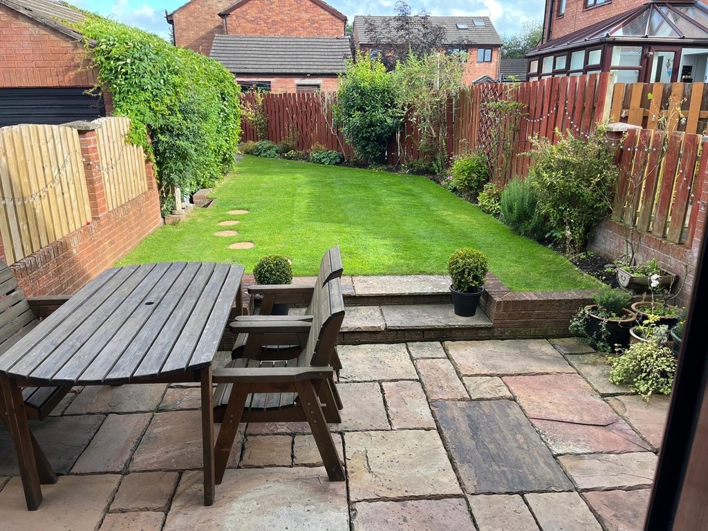 GARDEN Rear enclosed garden with paved patio area, raised lawned area with plants/shrubs and side access gate