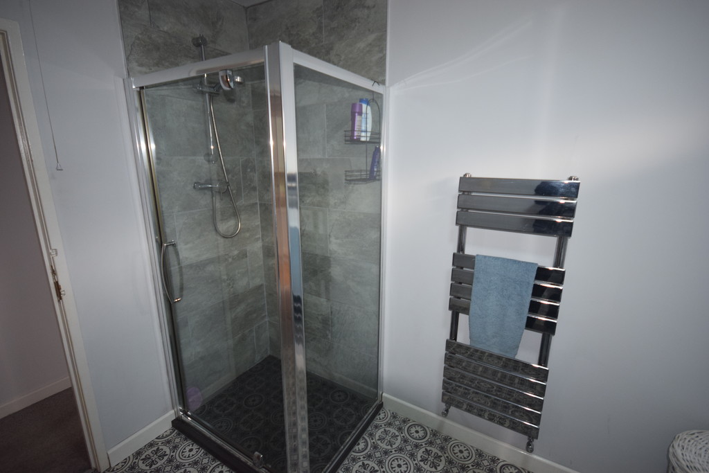 BATHROOM Double glazed frosted window, radiator, modern fitted 3-piece suite, low level WC with hand wash basin with mixer taps and vanity unit, corner shower cubicle with mixer taps and tiled splash
