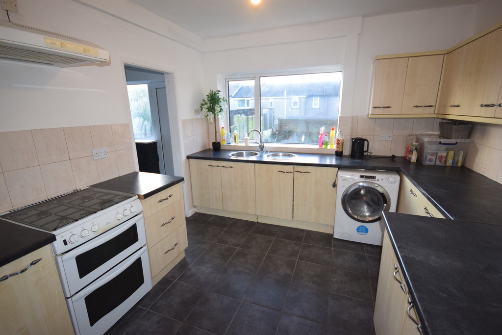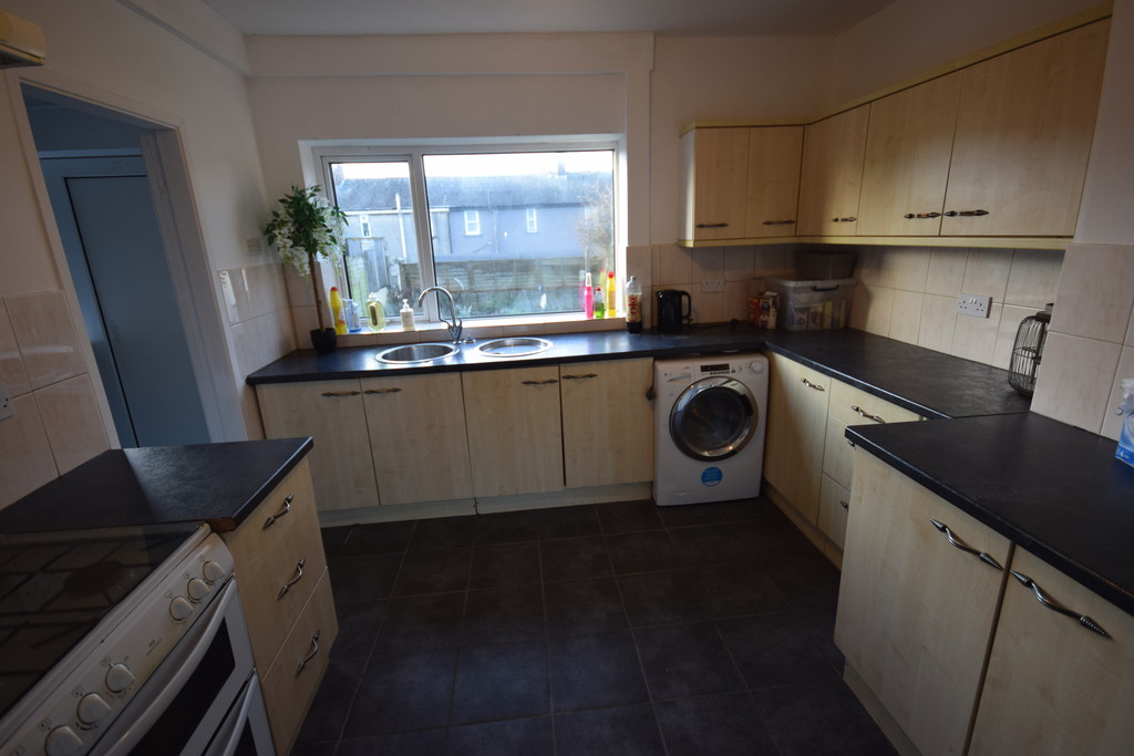 KITCHEN Double glazed window, fitted wall and base drawer units with work tops to compliment, circular stainless steel sink unit with drainer, mixer taps, cooker point with extractor over, plumb for washer, wine rack, tiled splash, tiled flooring, under stairs storage, open to