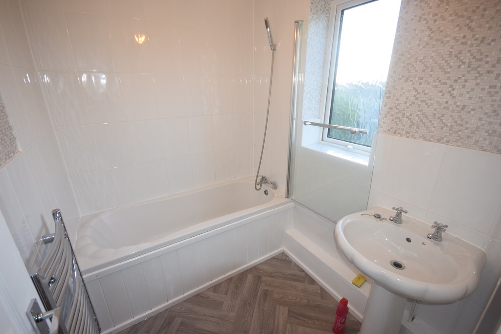BATHROOM Double glazed frosted window, pedestal hand wash basin with taps, panel enclosed bath with mixer taps/shower head, tiled splash and a radiator