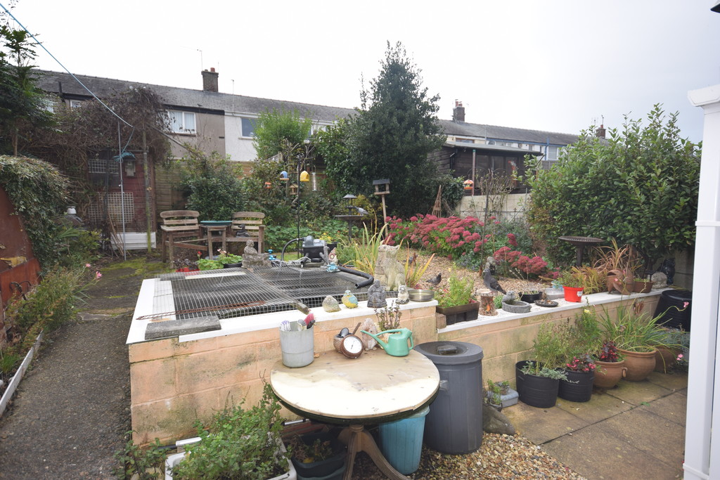 GARDEN Rear enclosed mature garden with paved area, paved seating area with fish pond, plants/shrubs, outhouse store/store sheds and water tap