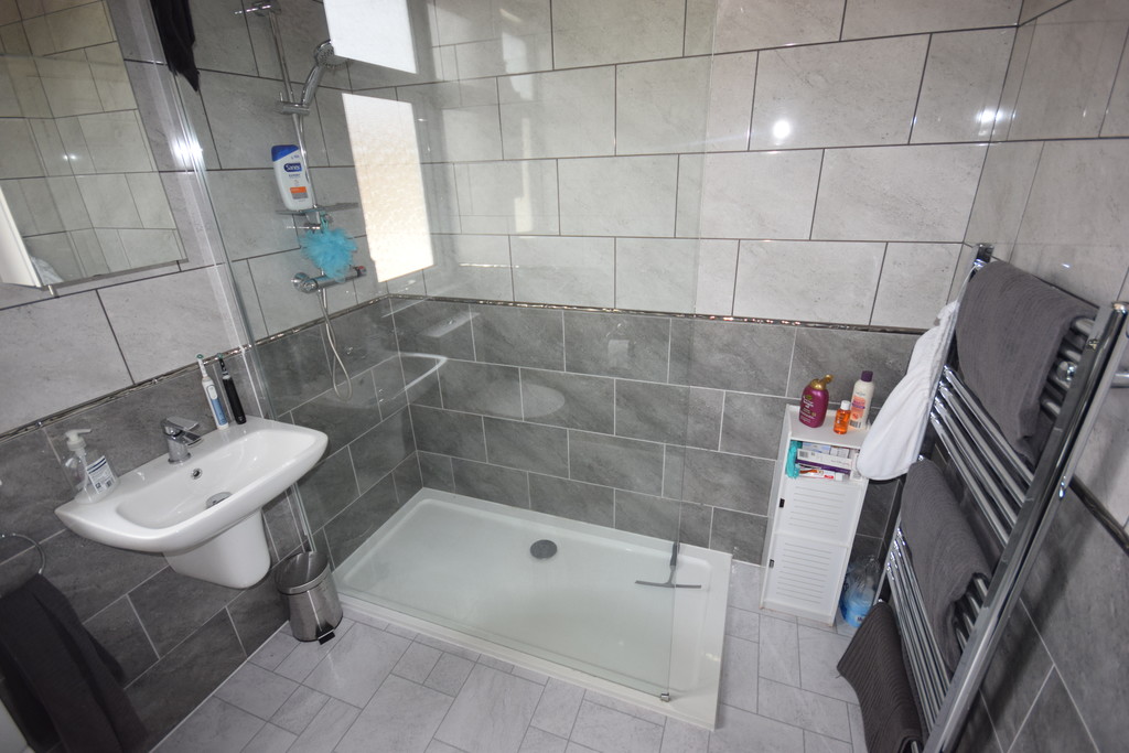 BATHROOM Double glazed frosted window, radiator, modern fitted shower room, low level WC, floating hand wash basin with mixer taps, walk-in shower cubicle with shower, tiled walls, panelled ceiling with spotlights