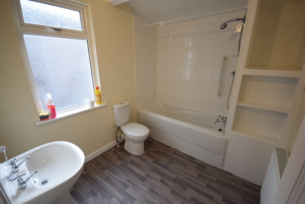 BATHROOM Double glazed frosted window, radiator, white 3-piece suite, low level WC, pedestal hand wash basin with taps, panelled enclosed bath with shower over, storage shelving and tiled splash