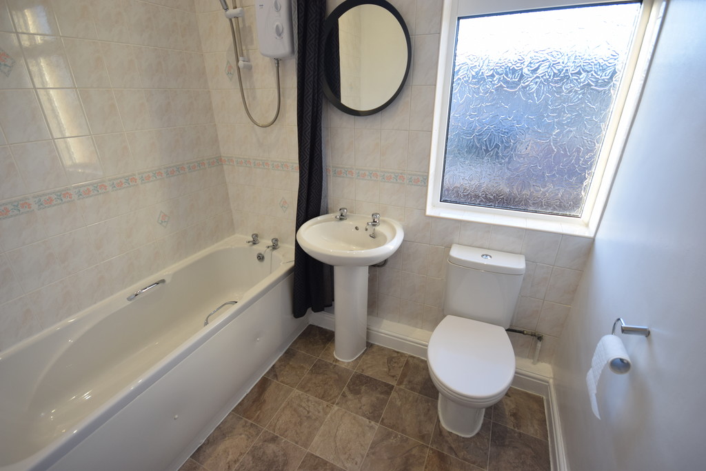 BATHROOM Double glazed frosted window, radiator, 3-piece white suite, low level WC, pedestal hand wash basin with taps, panelled enclosed bath with taps, shower over, tiled splash and ceiling spotlight