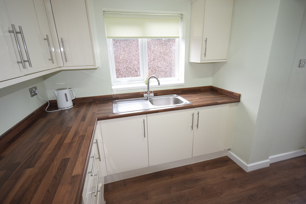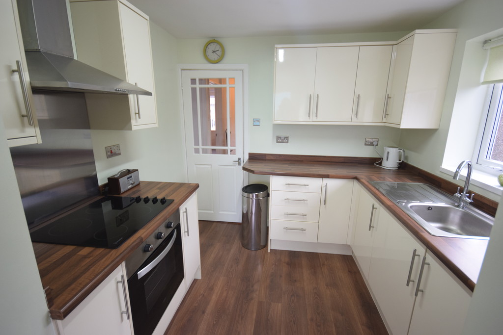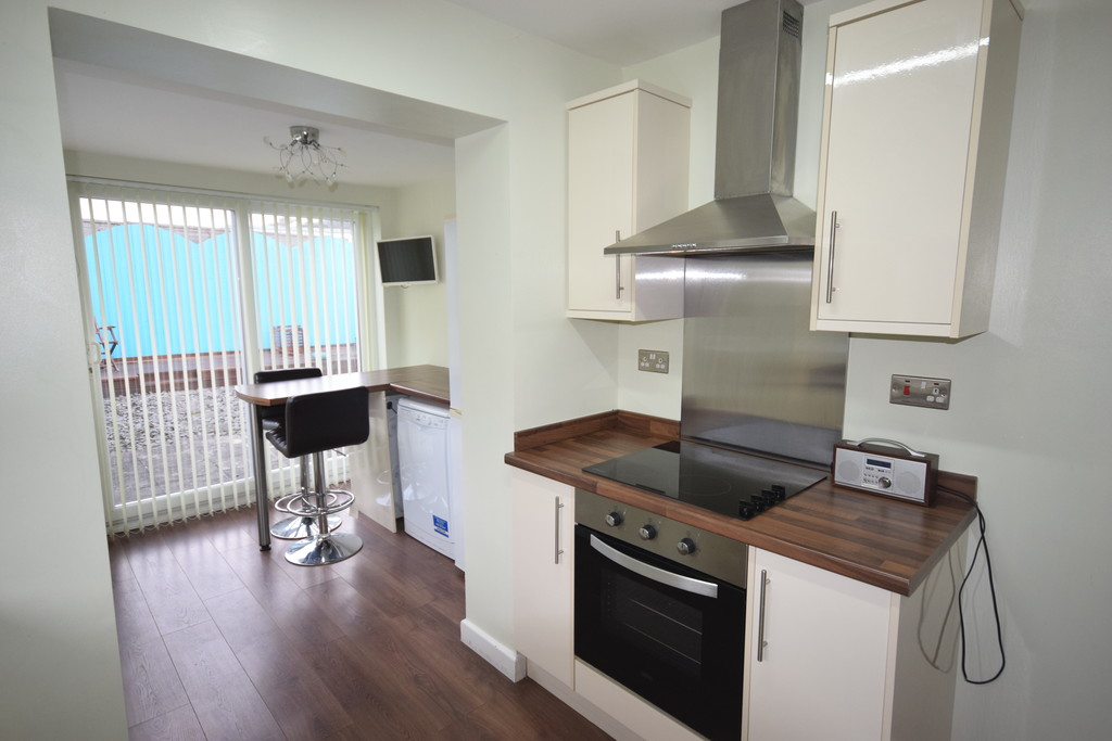 KITCHEN EXTENSION 8' 0" x 8' 11" (2.45m x 2.73m) Double glazed window, fitted wall base drawer units with worktops to compliment, inset stainless steel sink with mixer taps, integrated oven/4-ring hob with extractor oven, laminate flooring, open to dining area