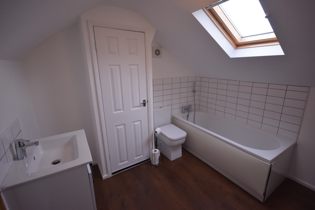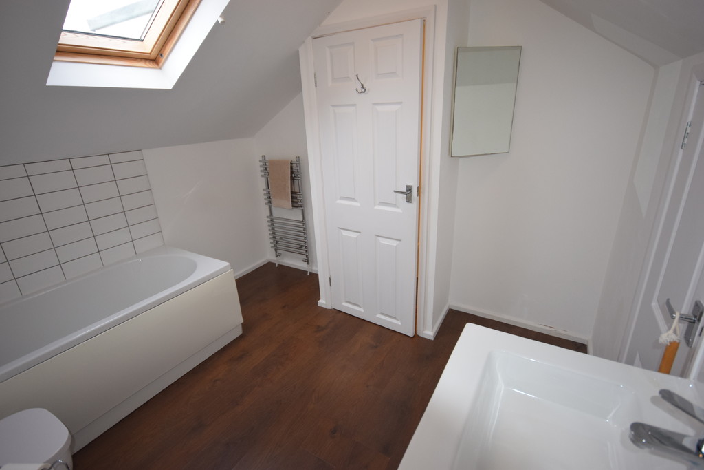 BATHROOM Double glazed Velux window, radiator, white 3-piece suite, low level WC, hand wash basin with mixer taps/vanity unit, panelled enclosed bath with mixer taps/shower head, tiled splash, storage cupboard, laminate flooring and storage in the eves