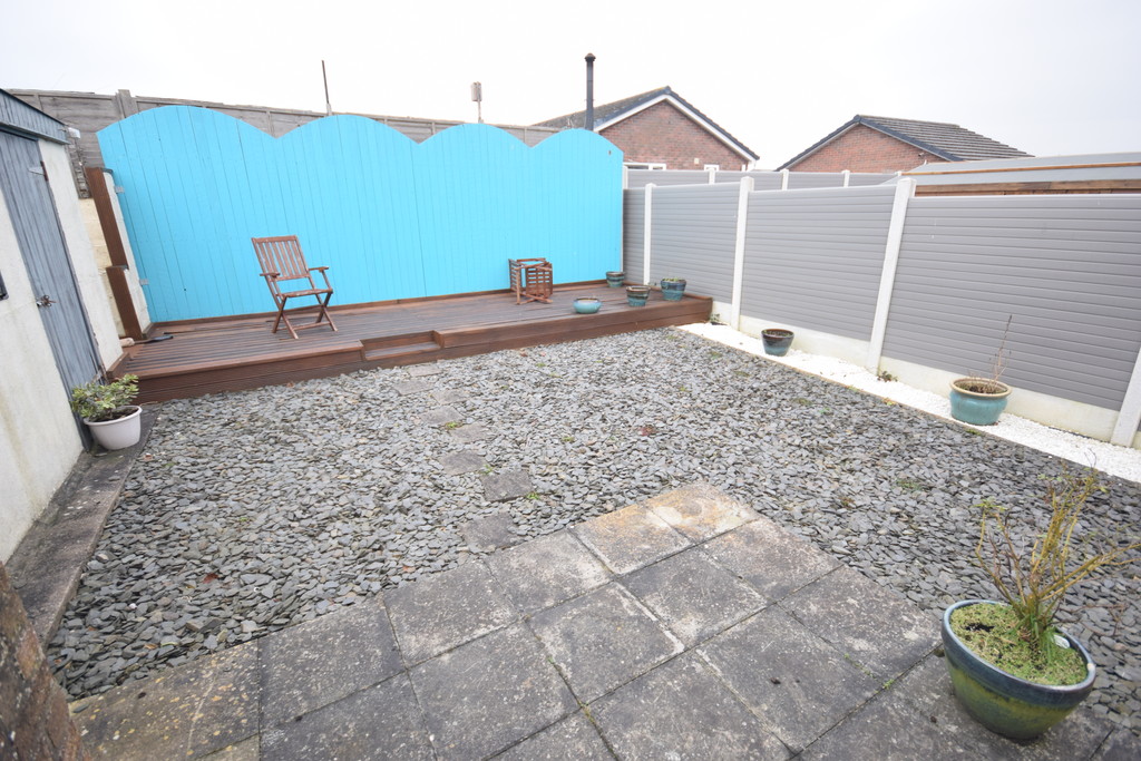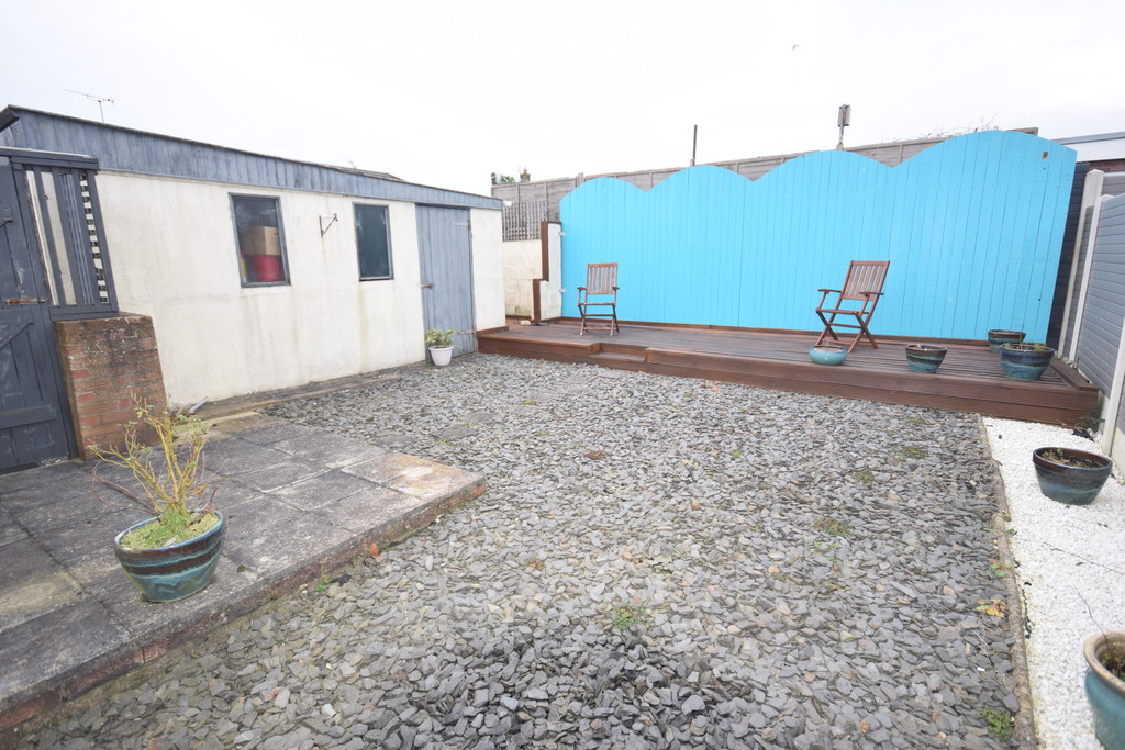 GARDEN Rear enclosed easy maintenance garden with paved seating area, raised decked area, shale area, access to garage, side access gate and water tap