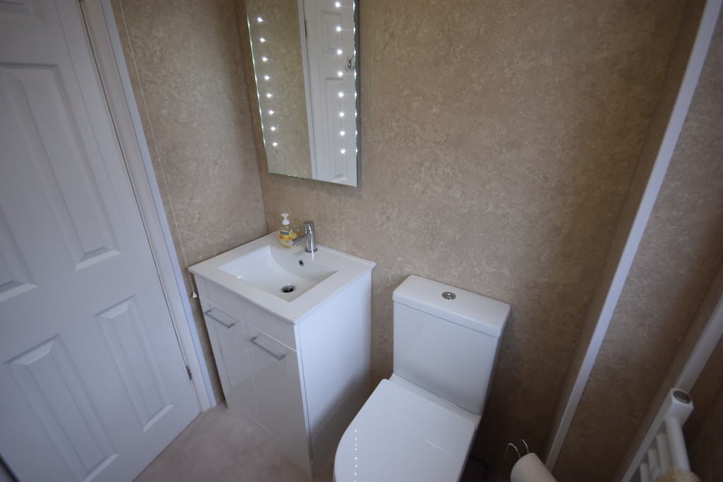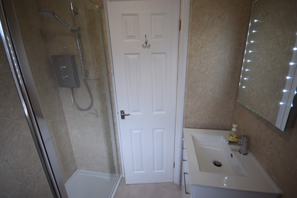 BATHROOM Double glazed frosted window, white modern 3-piece suite, low level WC, pedestal hand wash basin with mixer taps/vanity unit, walk-in shower cubicle with Mira shower and panelled walls