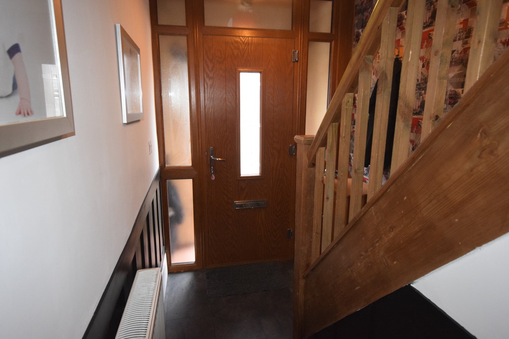 ENTRANCE HALL Double glazed frosted side panel, twin doors, spindle staircase to first floor, part panelled walls, laminate flooring and door to