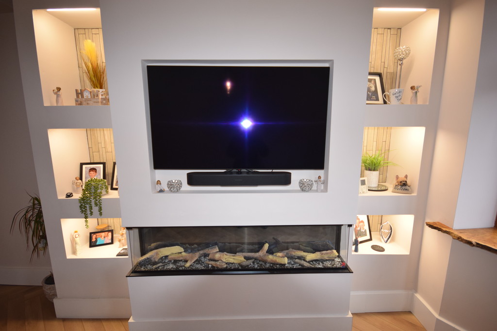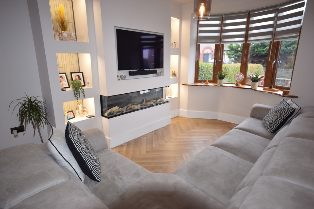 OPEN PLAN LOUNGE DINING ROOM 16' 8" x 23' 8" (5.09m x 7.23m) Double glazed window with stunning oak effect window ledge, feature media wall with shelving/lights, log effect fire, Karndean Herringbone Flooring throughout the ground floor, DiscreteHeat heating system (skirting board heating) double glazed window, understairs storage and doors to