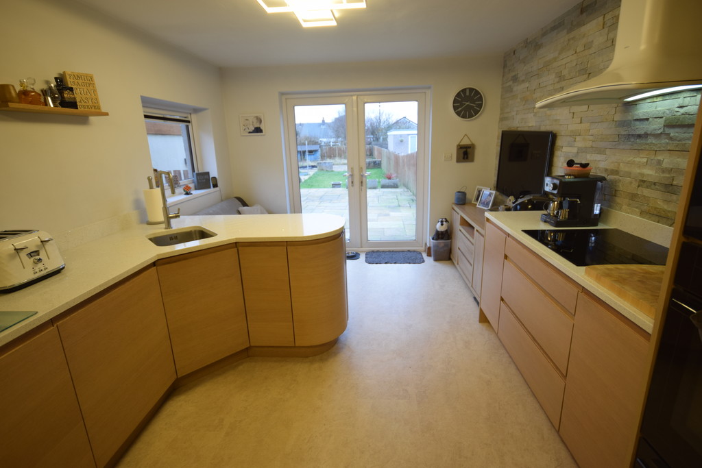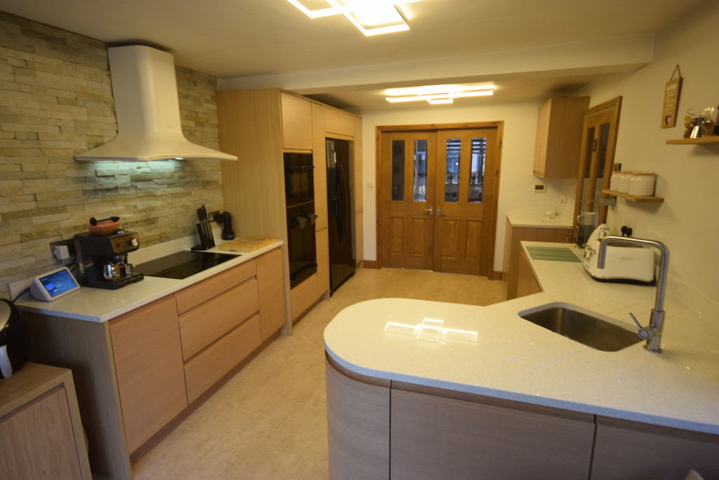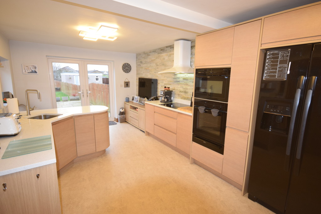 EXTENDED KITCHEN/DINER 18' 2" x 10' 5" (5.54m x 3.18m) Double glazed window, double glazed patio doors, fitted modern wall base drawer units with granite sparkle effect worktops to compliment, inset stainless steel sink with mixer taps, integrated double oven, 4-ring hob with extractor over, fitted American style fridge freezer, breakfast bar and door to