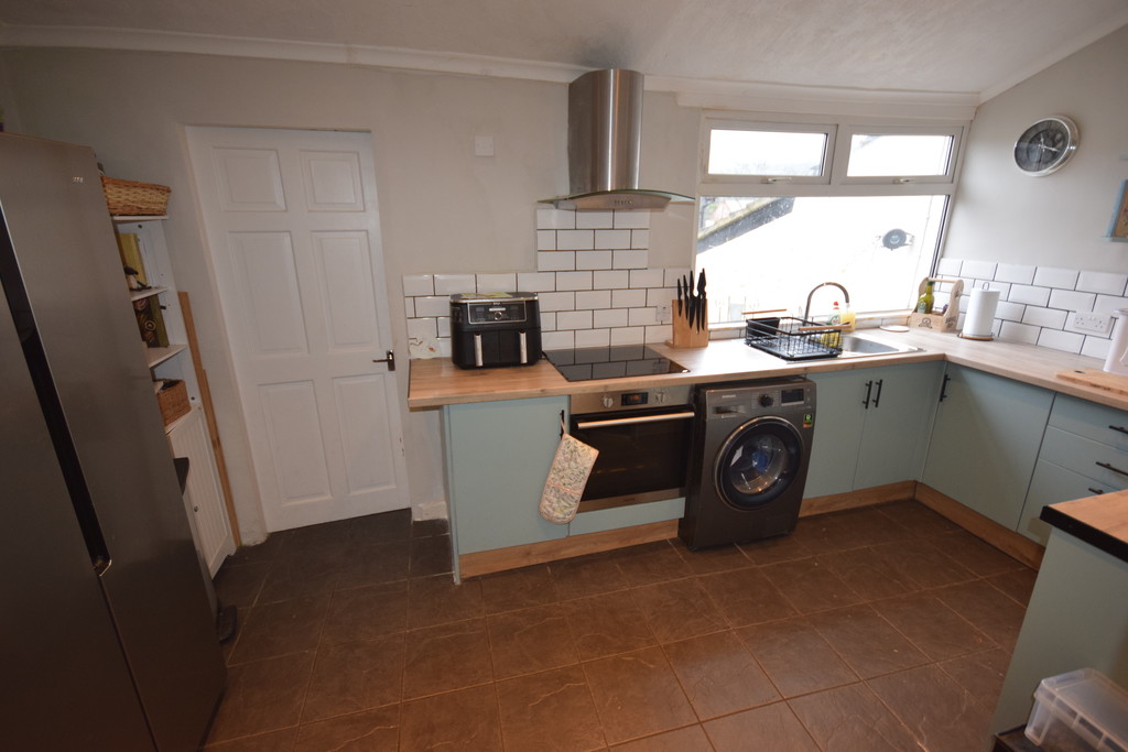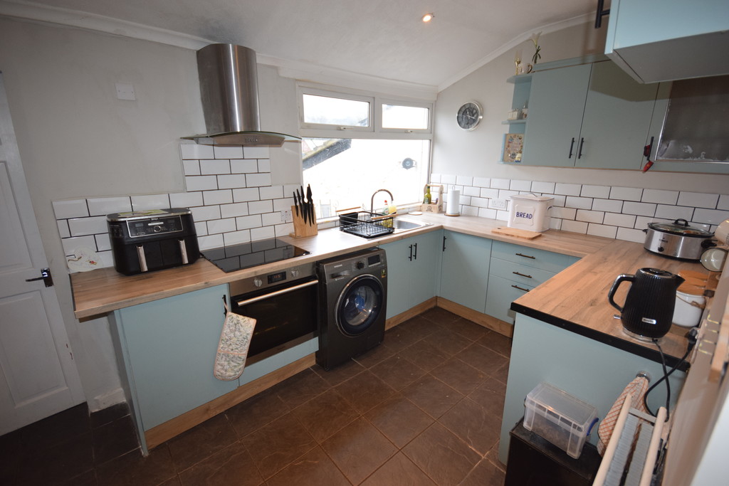 KITCHEN Double glazed window, radiator, fitted blue wall base drawer units with worktops to compliment, inset stainless steel sink with mixer taps, integrated oven with extractor over, plumbing for washer, tiled splash, tiled flooring, coved ceiling with spotlights and door to