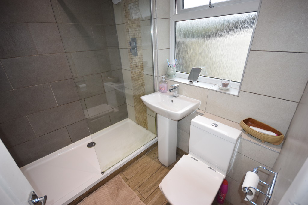 GF SHOWER ROOM Double glazed frosted window, fitted modern white 3-piece suite, low level WC, feature hand wash basin with mixer taps, double size shower cubicle with shower, tiled walls, tiled flooring, panelled ceiling with spotlights