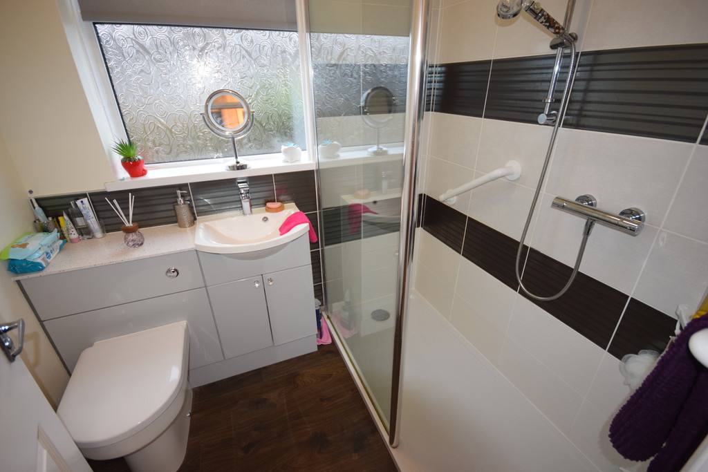 BATHROOM Double glazed frosted window, modern fitted white 3-piece suite, low level WC with hand wash basin, mixer taps and vanity unit, double size walk in shower unit with shower, tiled splash and laminate flooring