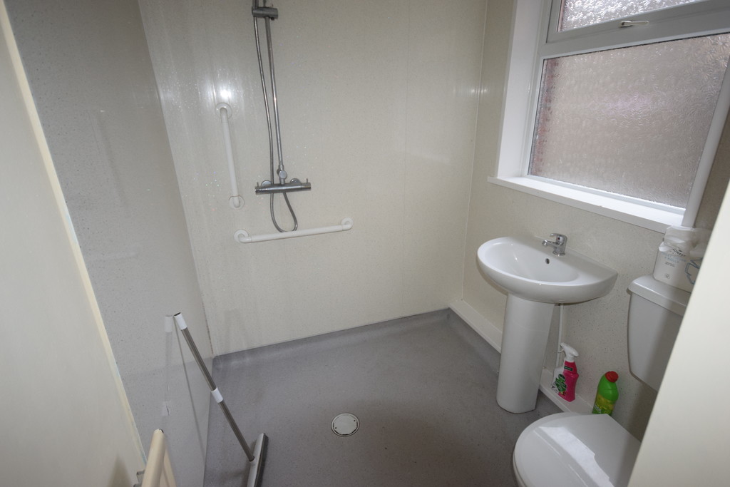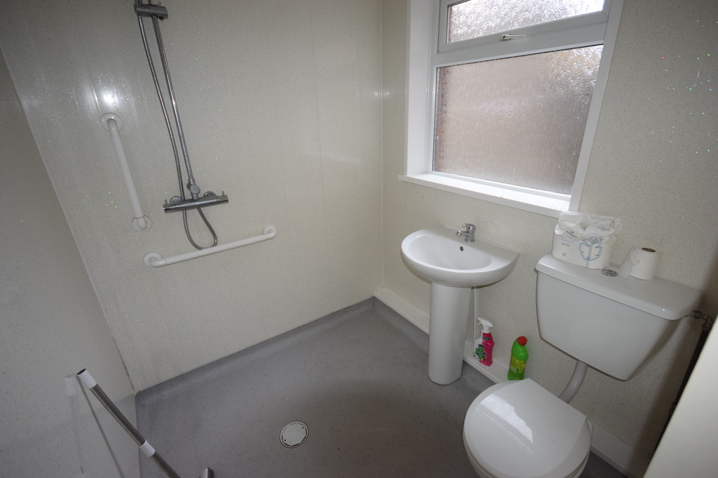 GROUND FLOOR BATHROOM Double glazed window, radiator, low level WC, pedestal hand wash basin with taps, wall mounted double headed shower, wet room style flooring and part panelled walls