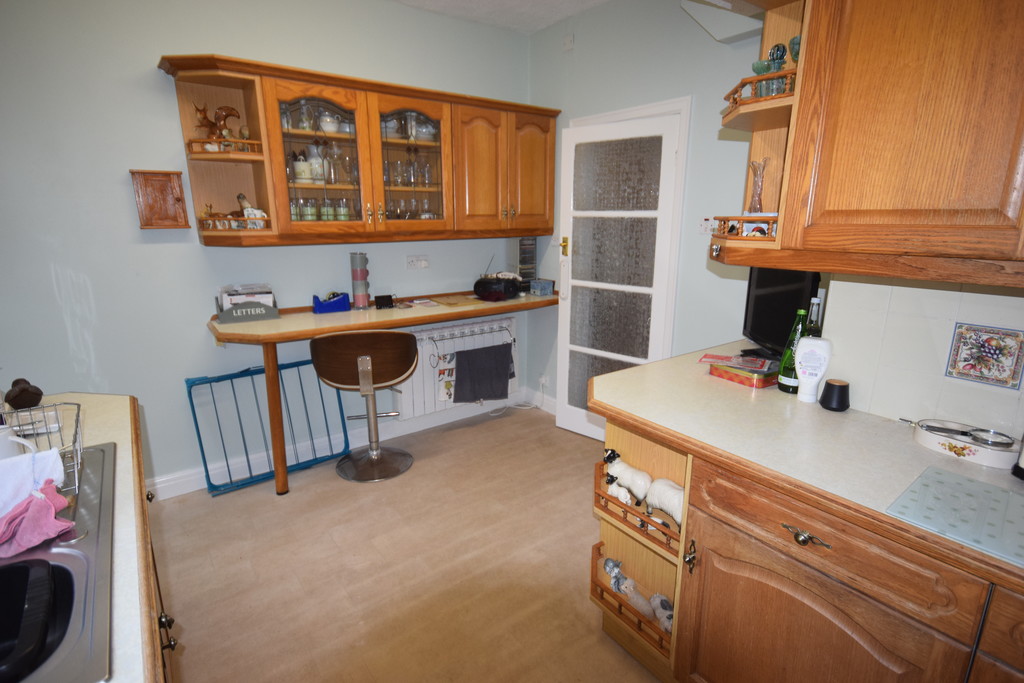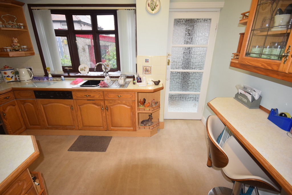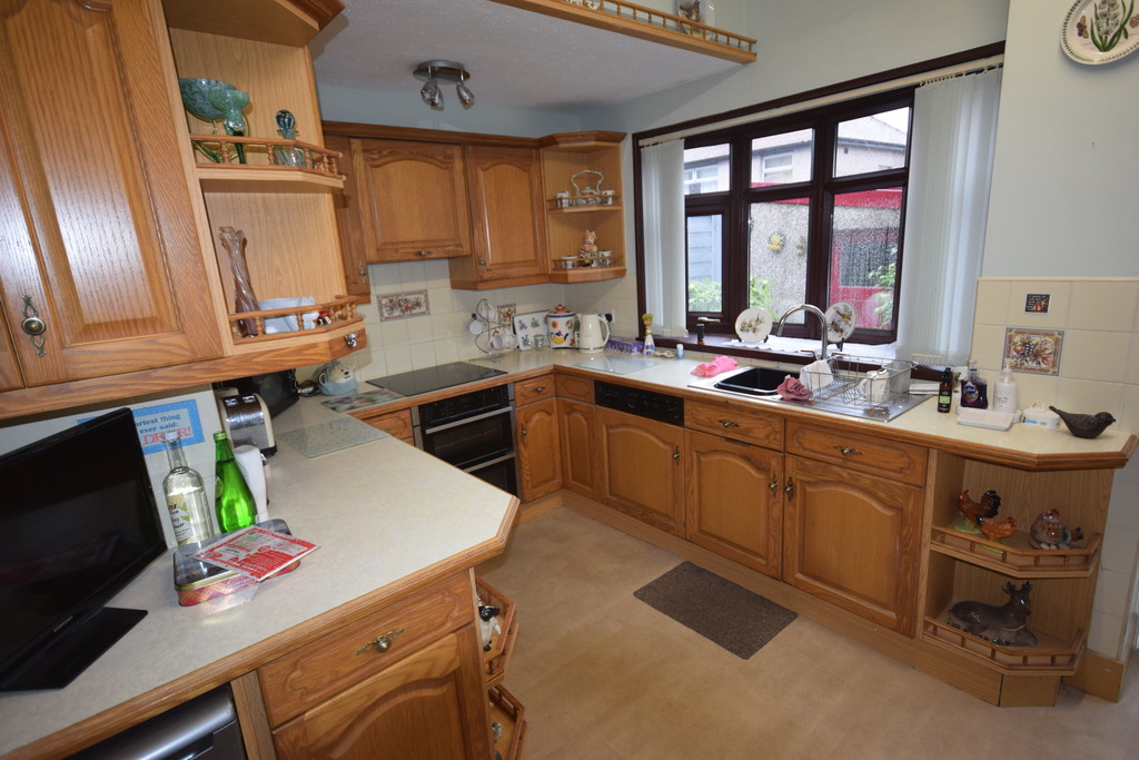 EXTENDED KITCHEN/DINER Double glazed window, door to rear porch, fitted wall base drawer units with worktops to compliment, integrated double oven with 4-ring hob, extractor over, stainless steel sink unit with mixer taps, breakfast bar, glass display units and tiled splash