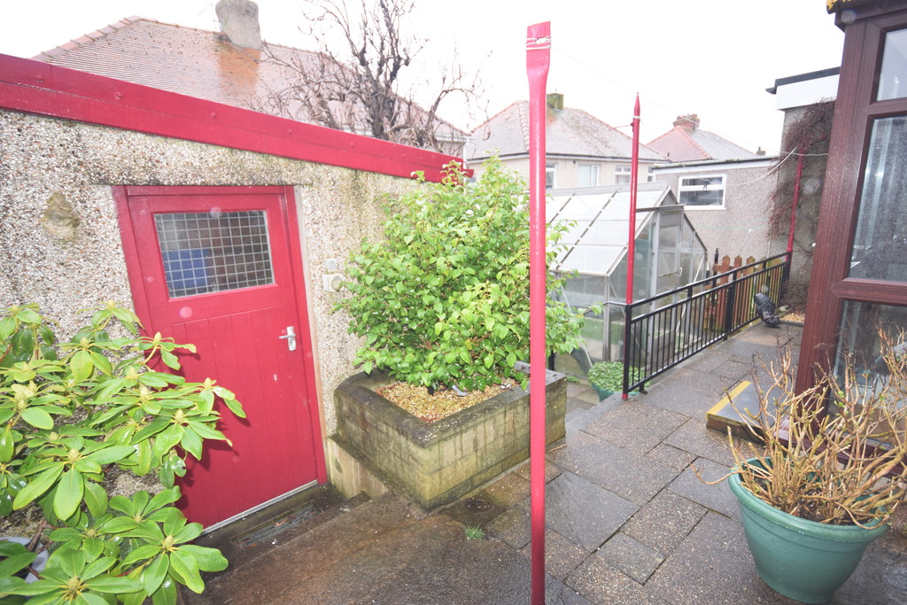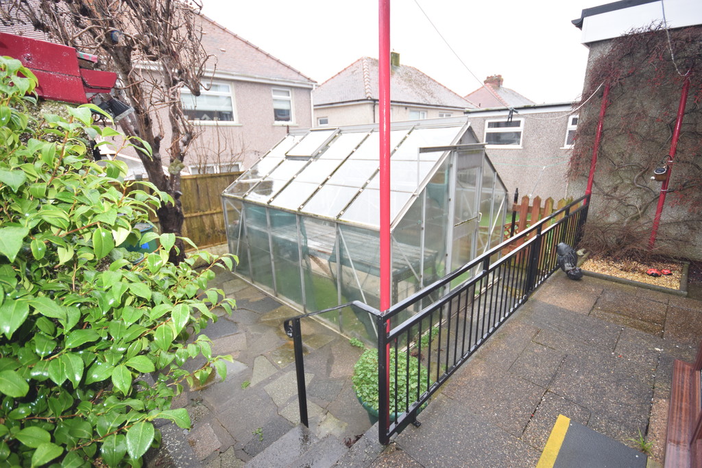 GARDEN Rear garden with paved seating area, steps to greenhouse, paved area, store/outhouse, side access to front garage/store