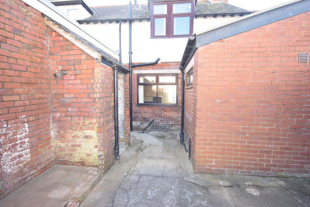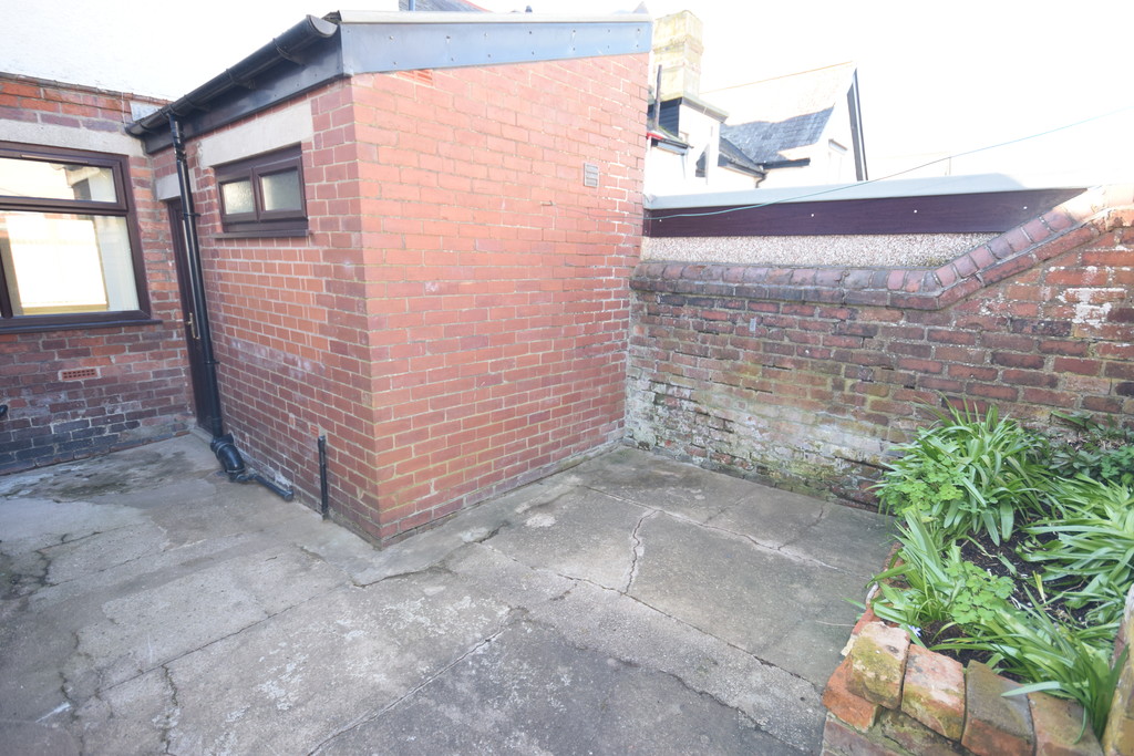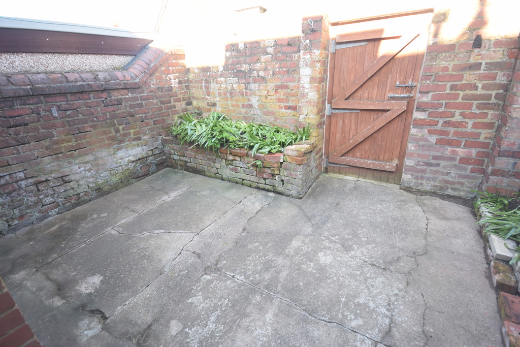 YARD Enclosed rear yard with paved seating area, outhouse/store and access gate