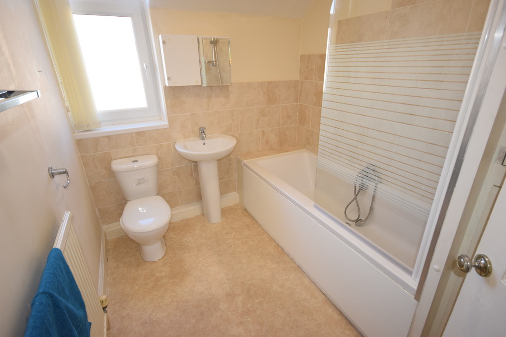 BATHROOM Double glazed frosted window, white 3-piece suite, low level WC, pedestal hand wash basin with mixer taps, panelled enclosed bath with shower over, storage cupboard (boiler) tiled splash