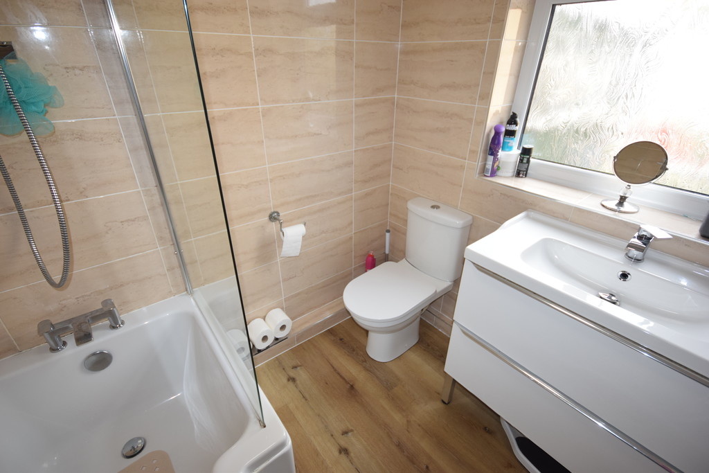BATHROOM Double glazed frosted window, radiator, fitted white suite, low level WC, hand wash basin with mixer taps/vanity unit, panelled enclosed shaped bath with shower over, tiled splash walls, laminate flooring and panelled ceiling