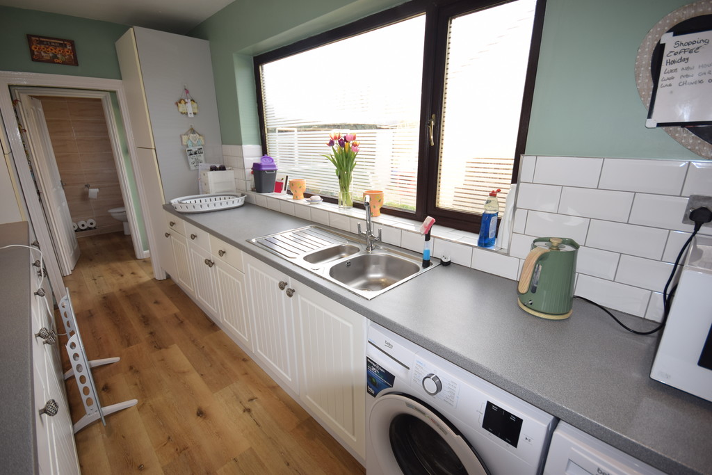 KITCHEN Double glazed window, fitted white wall base drawer unit with worktops to compliment, inset 1/12 bowl stainless steel sink unit with mixer taps, inset oven, 4-ring hob with extractor over, plumbing for washer, tiled splash, laminate flooring, ceiling spotlights and open to rear hall