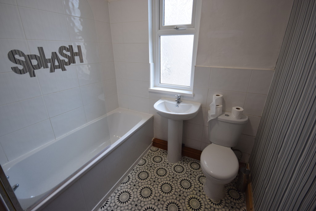 BATHROOM Double glazed frosted window, low level WC, pedestal hand wash basin with mixer taps, panelled enclosed bath with shower over, tiled splash and radiator