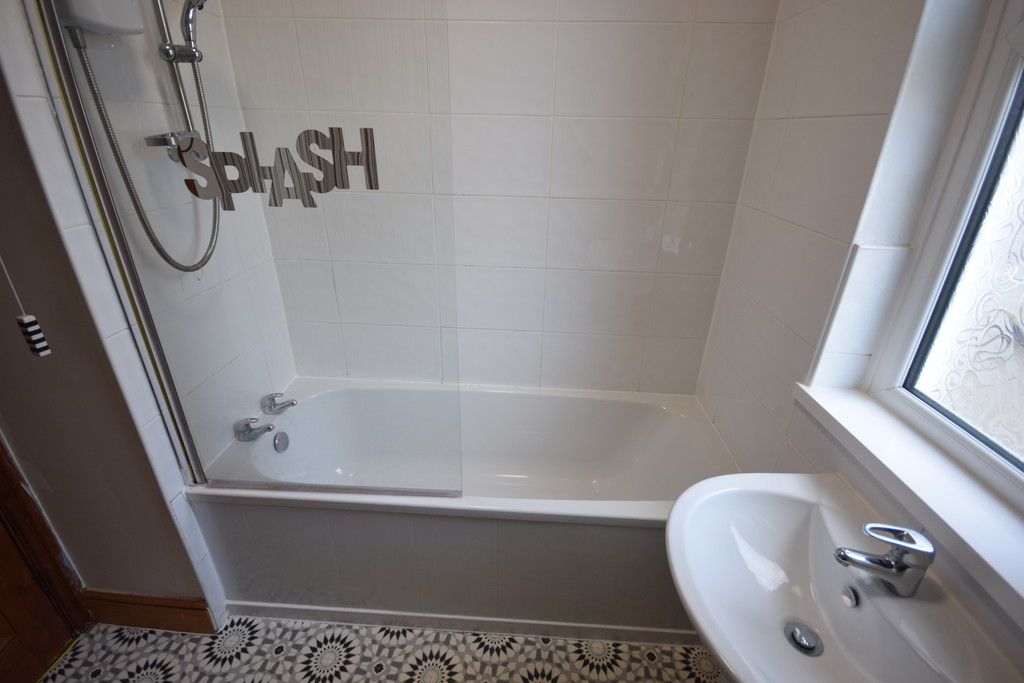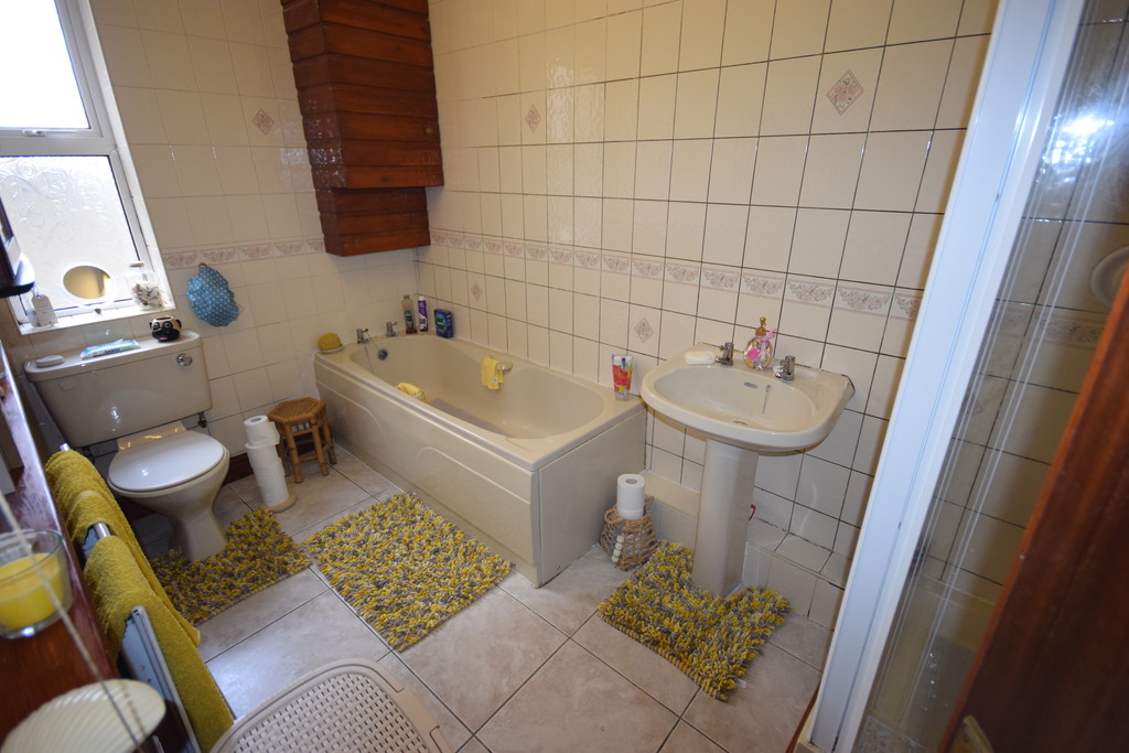 BATHROOM Double glazed frosted window, 4-piece suite, low level WC, pedestal hand wash basin with taps, panelled enclosed bath, corner shower cubicle with shower, tiled splash, tiled flooring, radiator and part panelled walls