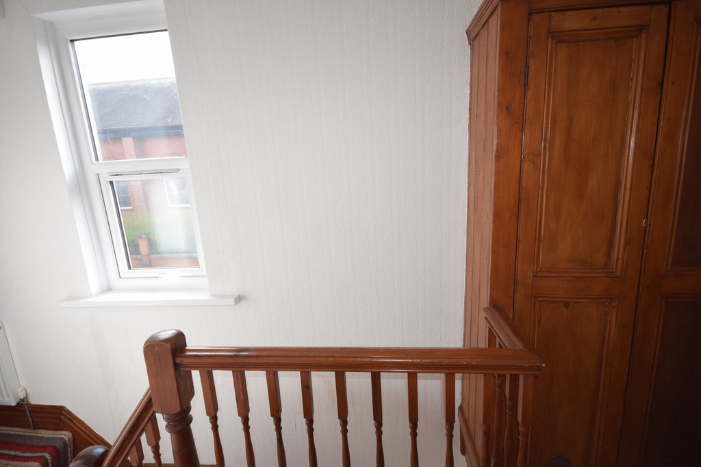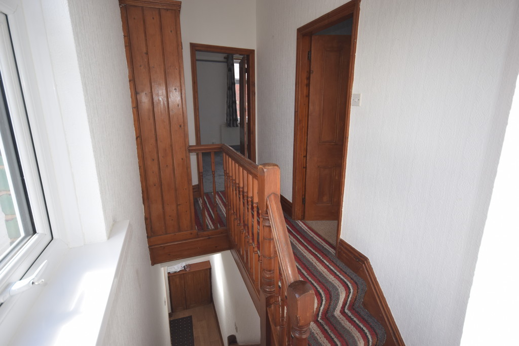 HALLWAY Spindle balustrade, double glazed window, radiator, storage cupboard and doors to