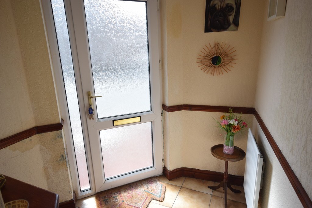 ENTRANCE Ground floor door with frosted side panel, tiled flooring, dado rail and doors to