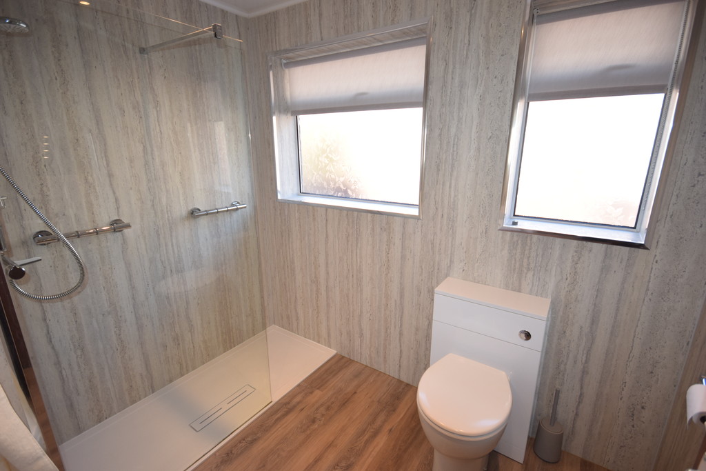 BATHROOM Double glazed frosted windows, radiator, modern fitted shower-room with low level WC, hand wash basin with mixer taps/vanity unit, shower with double size tray, panelled walls, panelled ceiling with spotlights and laminate flooring